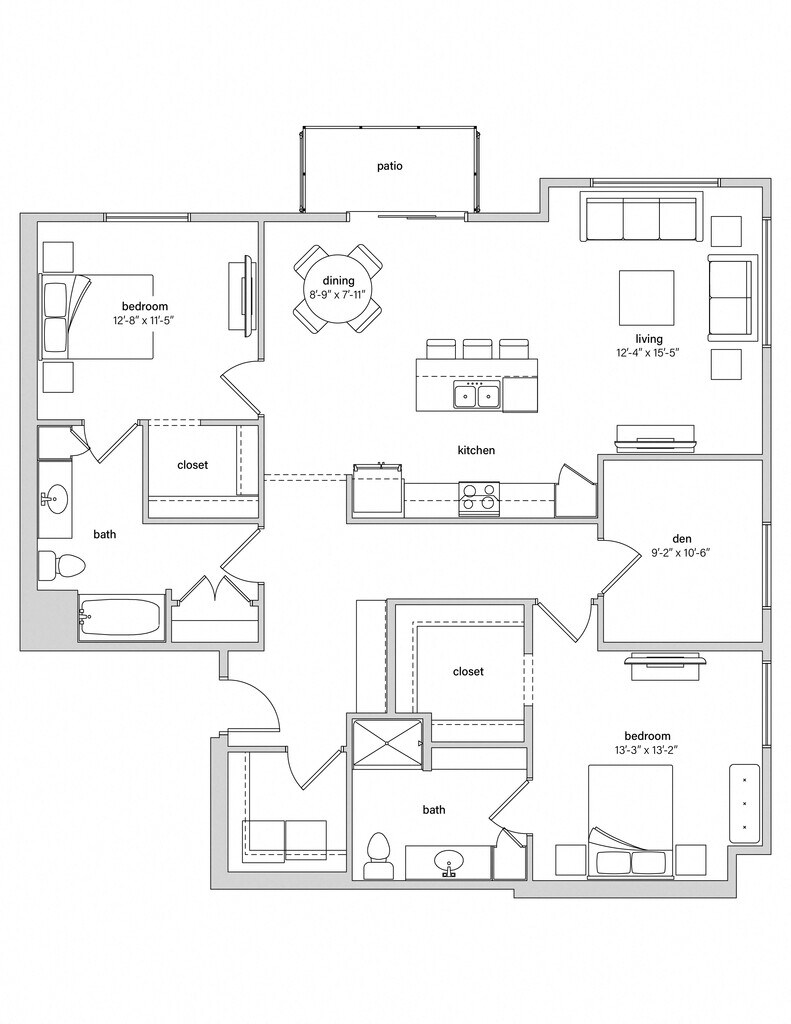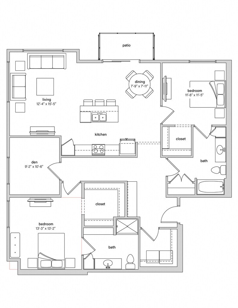 Lariat - Plano 3 Unidad de apartamento: 8201Modelo de apartamento: Lariat$1,6571 Dormitorio, 1 Baño, 707 sq ftDisponible AhoraBridle- Open One Bedroom + Den