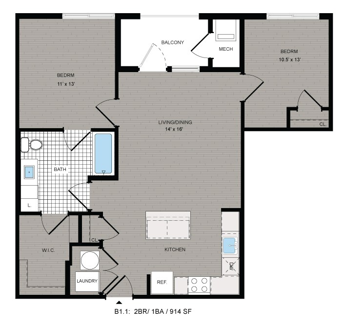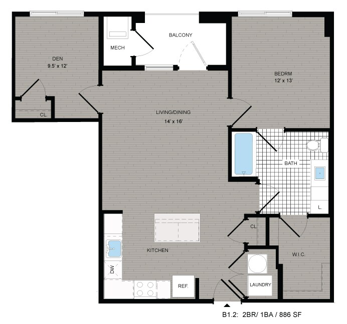 2 Dormitorios, 1 Baño, 886 pies²Galería del Modelo
