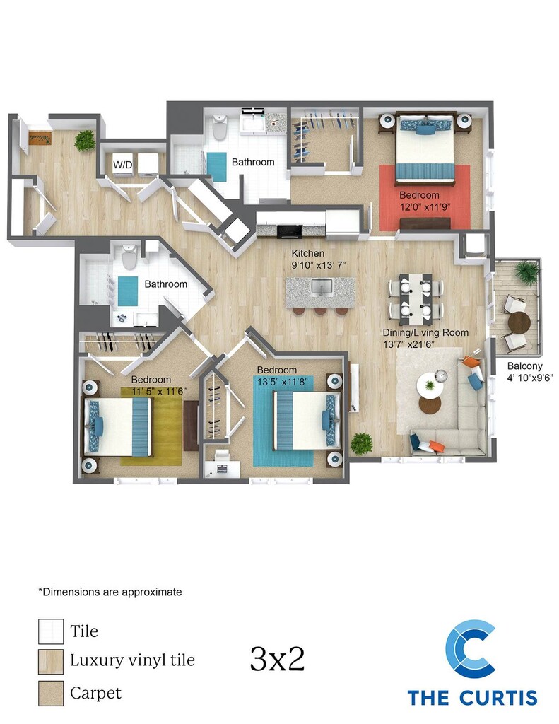 Modelo de apartamento: Three Bedroom Two BathroomDesde $3,2853 Dormitorios, 2 Baños, 1300-1400 sq ftDisponible Ahora![]()