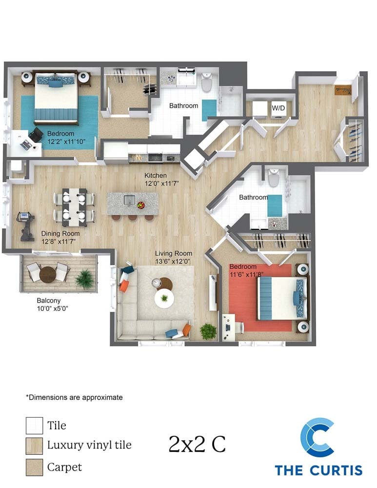 Modelo de apartamento: Two Bedroom Two BathroomDesde $2,9692 Dormitorios, 2 Baños, 1010-1250 sq ftDisponible Ahora![]()