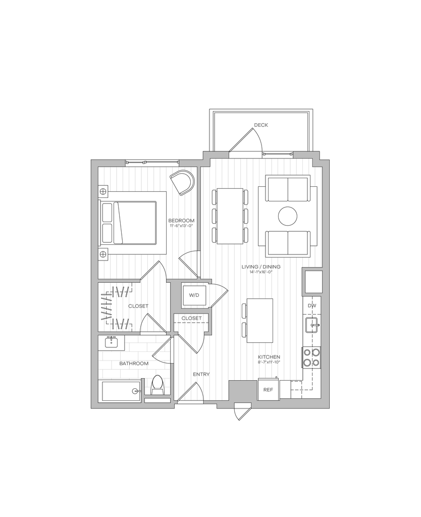 1 Dormitorio, 1 Baño, 707-820 pies²Precio Mensual TotalDisponible AhoraGalería del Modelo