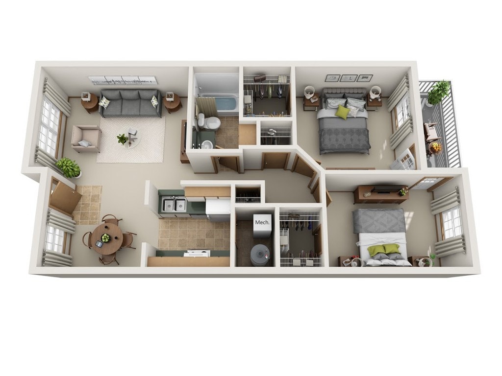 2 Dormitorios, 1 Baño, 900 pies²Disponible AhoraGalería del Modelo