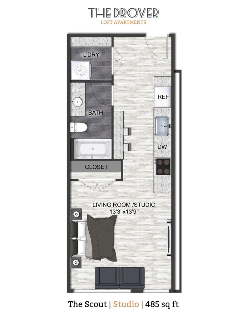 Modelo de apartamento: The Scout$1,039Estudio, 1 Baño, 485 sq ftDisponible AhoraLos planos son representaciones artísticas. Todas las dimensiones son aproximadas. El producto y las especificaciones reales pueden variar en tamaño o detalle. No todas las características están disponibles en cada vivienda en alquiler. Por favor, consulta con un representante para obtener más detalles.