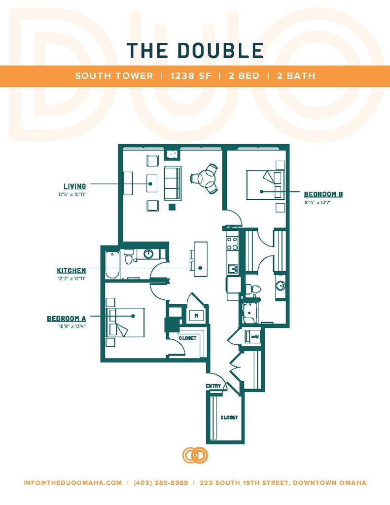 Double - Plano 1 Unidad de apartamento: 1701Modelo de apartamento: Double$2,3002 Dormitorios, 2 Baños, 1246 sq ftDisponible April 3, 2026Duet