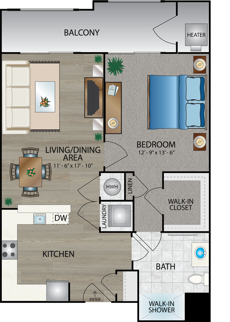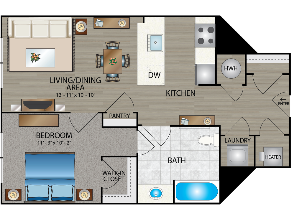 Modelo de apartamento: AdelphiaLlame para Precios1 Dormitorio, 1 Baño, 695 sq ftNo DisponibleAdelphia - Plano 1 Allaire