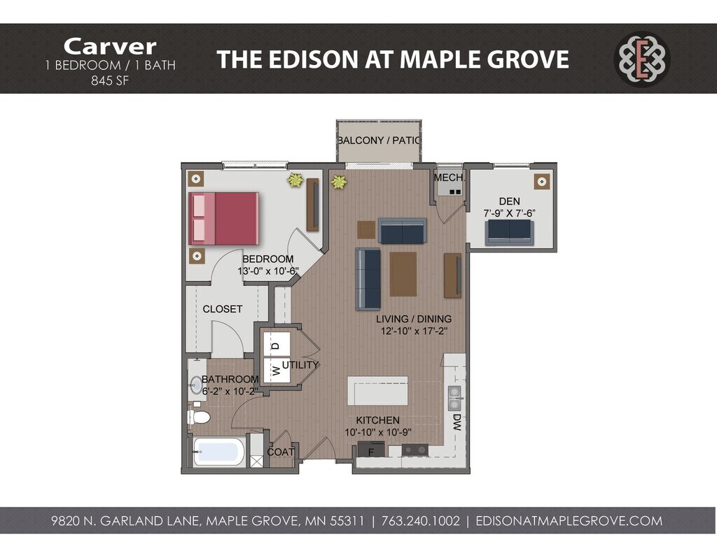 Modelo de apartamento: Carver (w/Den)Llame para Precios1 Dormitorio, 1 Baño, 845 sq ftNo DisponibleCarver (w/Den) - Plano 1 Fulton