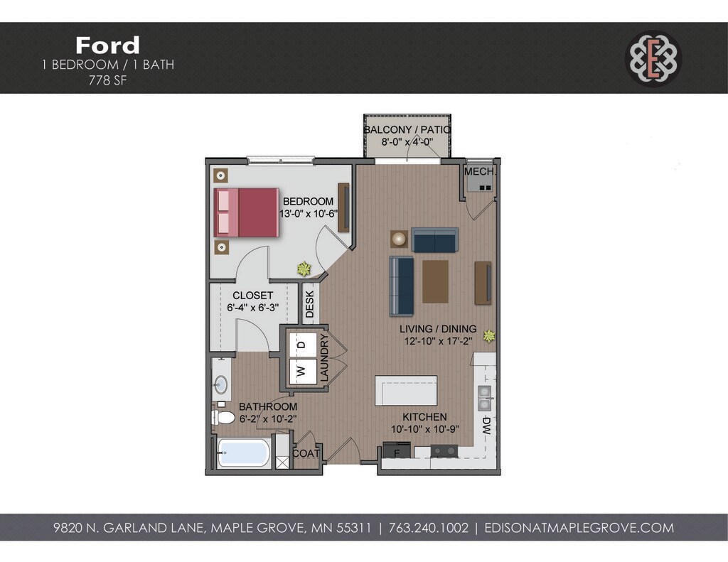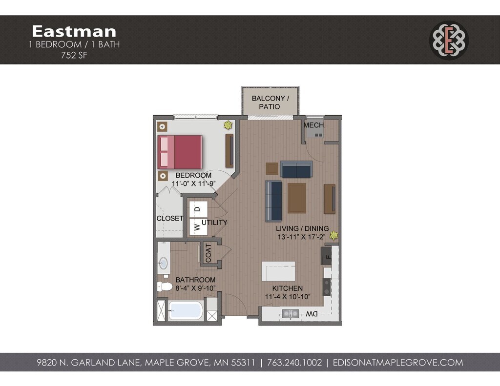 Modelo de apartamento: EastmanLlame para Precios1 Dormitorio, 1 Baño, 752 sq ftNo DisponibleEastman - Plano 1 Ford