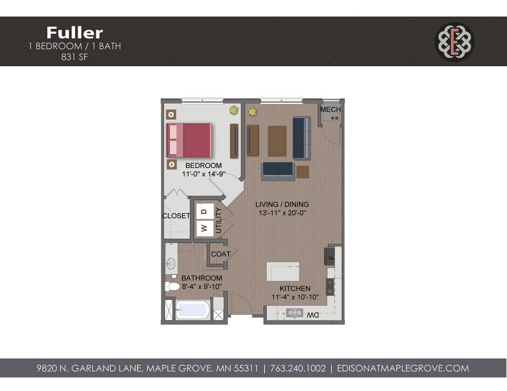 Modelo de apartamento: FullerLlame para Precios1 Dormitorio, 1 Baño, 831 sq ftNo DisponibleFuller - Plano 1 Carver (w/Den)