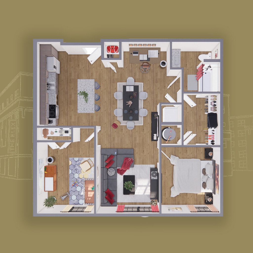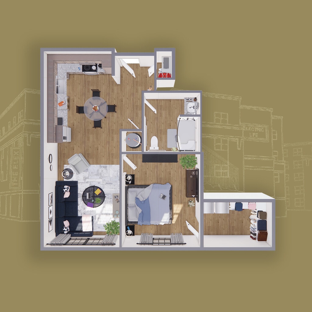 1 Dormitorio, 1 Baño, 687 pies²Disponible AhoraGalería del Modelo