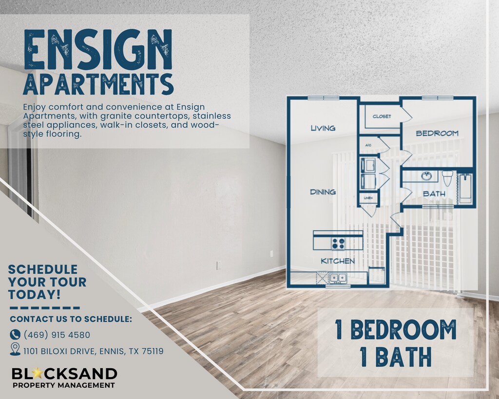 The Ensign Apartments se encuentra en el código postal 75119 de Ennis, TX. Esta comunidad está gestionada profesionalmente por Blacksand Property Management