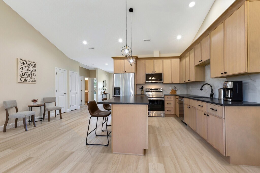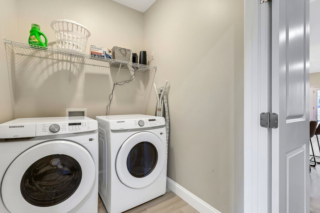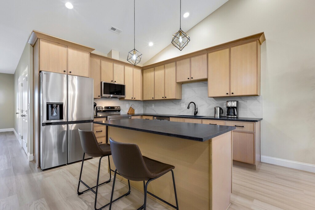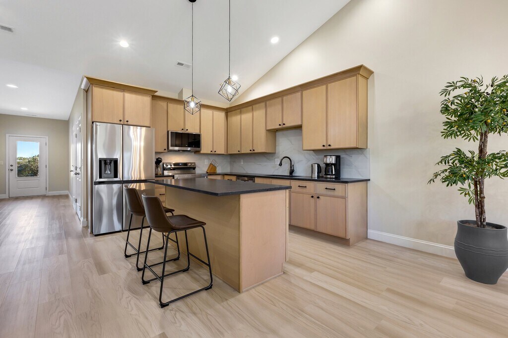 As you enter through the front door, a spacious 7-foot-wide hallway welcomes you and leads into the open-concept living room, kitchen, and dining area. The beautifully appointed kitchen features 42-inch natural oak cabinets, granite countertops with a leather finish, crown molding, and modern lighting that ties the space together. With plenty of storage and thoughtful design, its both functional and inviting. Off the main hallway, a smaller private corridor leads to the two spacious secondary bedrooms, each with its own walk-in closet and full bathroom, offering privacy and convenience away from the main entrance. The primary suite is generously sized at 13 x 15 feet and includes a private bathroom with double vanity, walk-in shower, water closet, and a large walk-in closet. Luxury details flow throughout the home, including LVP flooring, 5-inch baseboards for an upscale feel, and window blinds in every bedroom. This home comes fully furnished with premium furniture: The primary bedroom features a king-size bed with cotton linens. Each secondary bedroom offers a queen-size bed with its own high-quality linens. The living room is set up for comfort, whether you're enjoying a relaxed evening or watching TV. The kitchen is fully stocked with everything you need, including bakeware, pots and pans, coffee maker, kettle, toaster, and microwave. Youll also find a washer and dryer, iron, and ironing board for convenience. Bath towels and linens are provided, ensuring a comfortable stay. The open-concept design allows everyone to stay connected whether cooking in the kitchen, dining at the table, or relaxing in the living room, conversation and connection flow easily. Located on a small quiet street.