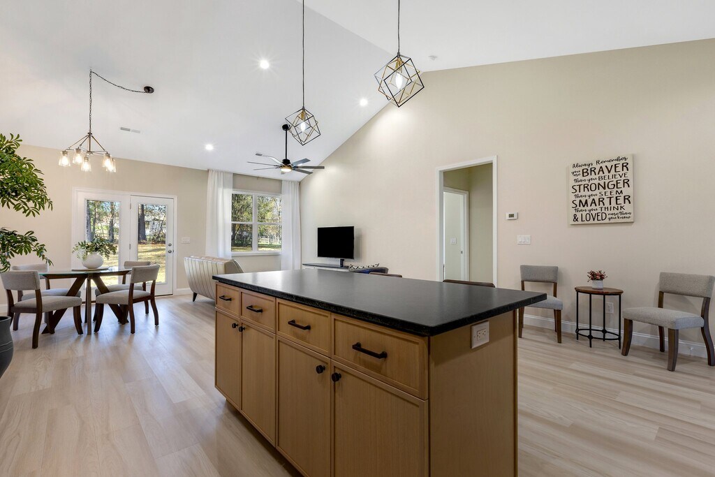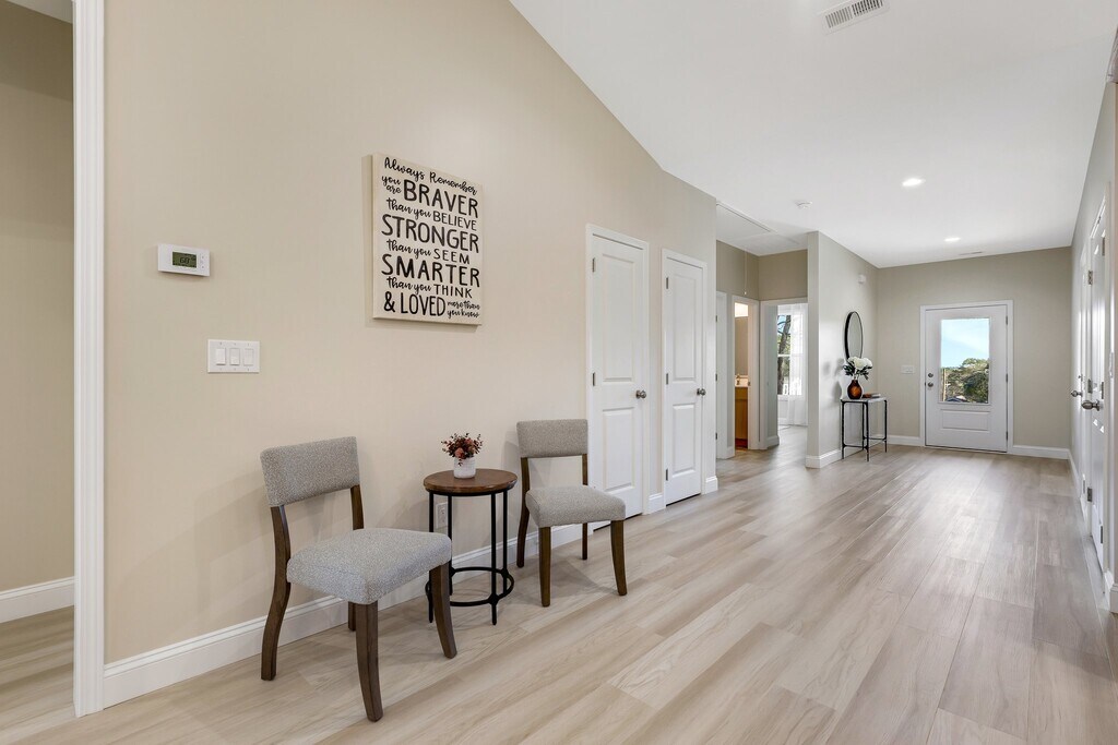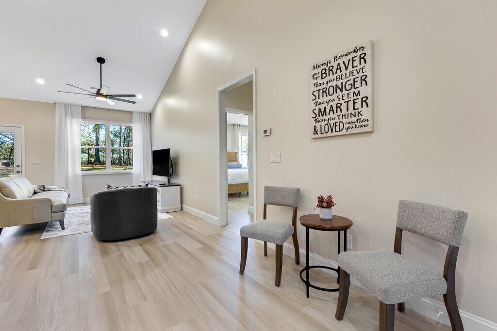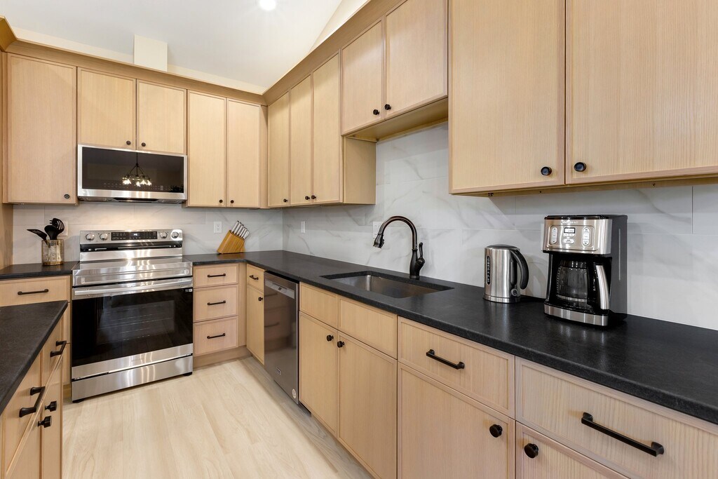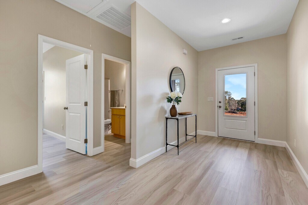 As you enter through the front door, a spacious 7-foot-wide hallway welcomes you and leads into the open-concept living room, kitchen, and dining area. The beautifully appointed kitchen features 42-inch natural oak cabinets, granite countertops with a leather finish, crown molding, and modern lighting that ties the space together. With plenty of storage and thoughtful design, its both functional and inviting. Off the main hallway, a smaller private corridor leads to the two spacious secondary bedrooms, each with its own walk-in closet and full bathroom, offering privacy and convenience away from the main entrance. The primary suite is generously sized at 13 x 15 feet and includes a private bathroom with double vanity, walk-in shower, water closet, and a large walk-in closet. Luxury details flow throughout the home, including LVP flooring, 5-inch baseboards for an upscale feel, and window blinds in every bedroom. This home comes fully furnished with premium furniture: The primary bedroom features a king-size bed with cotton linens. Each secondary bedroom offers a queen-size bed with its own high-quality linens. The living room is set up for comfort, whether you're enjoying a relaxed evening or watching TV. The kitchen is fully stocked with everything you need, including bakeware, pots and pans, coffee maker, kettle, toaster, and microwave. Youll also find a washer and dryer, iron, and ironing board for convenience. Bath towels and linens are provided, ensuring a comfortable stay. The open-concept design allows everyone to stay connected whether cooking in the kitchen, dining at the table, or relaxing in the living room, conversation and connection flow easily. Located on a small quiet street.