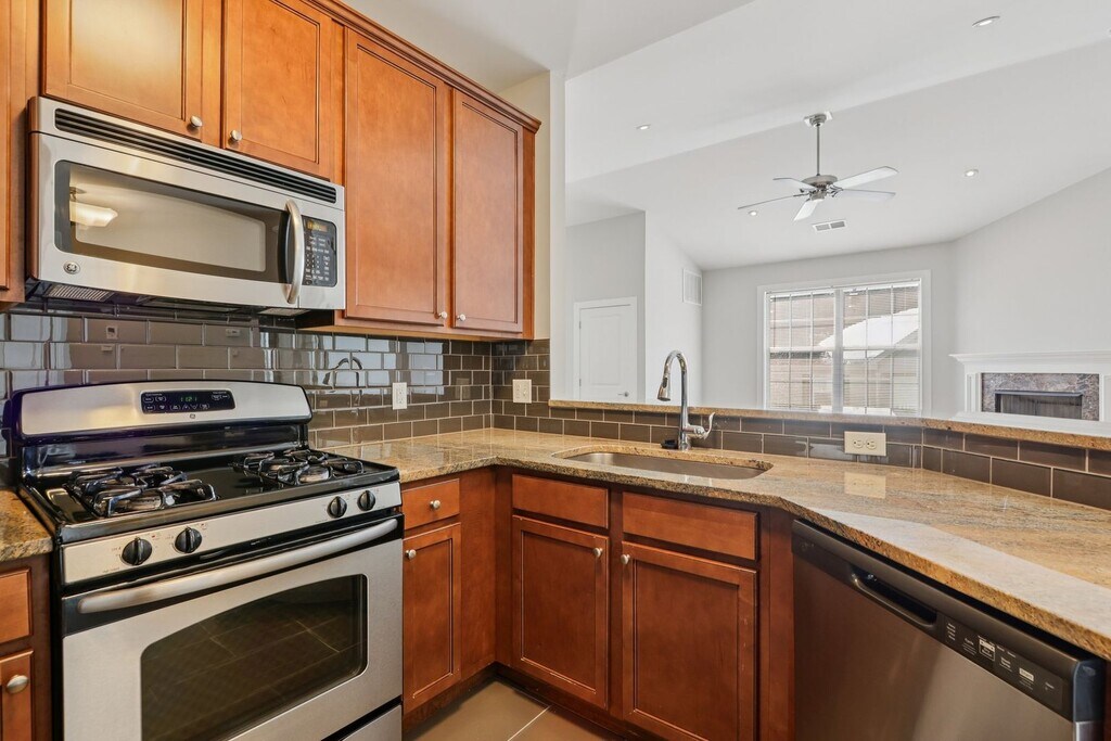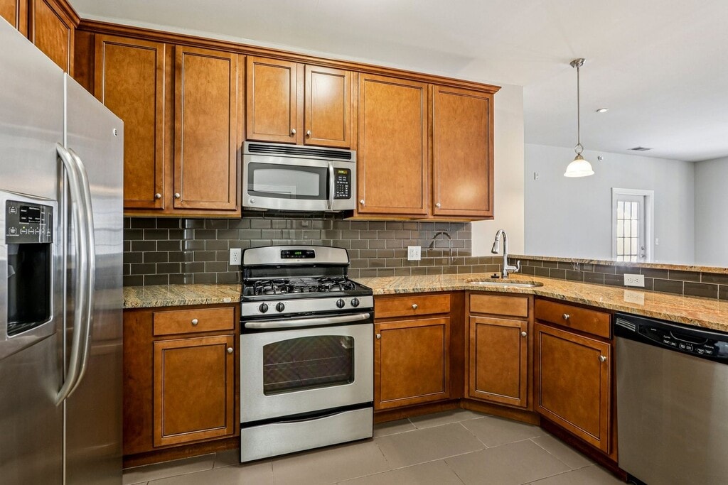 - Los electrodomésticos de la cocina incluyen refrigerador GE, estufa a gas, microondas y lavavajillas.