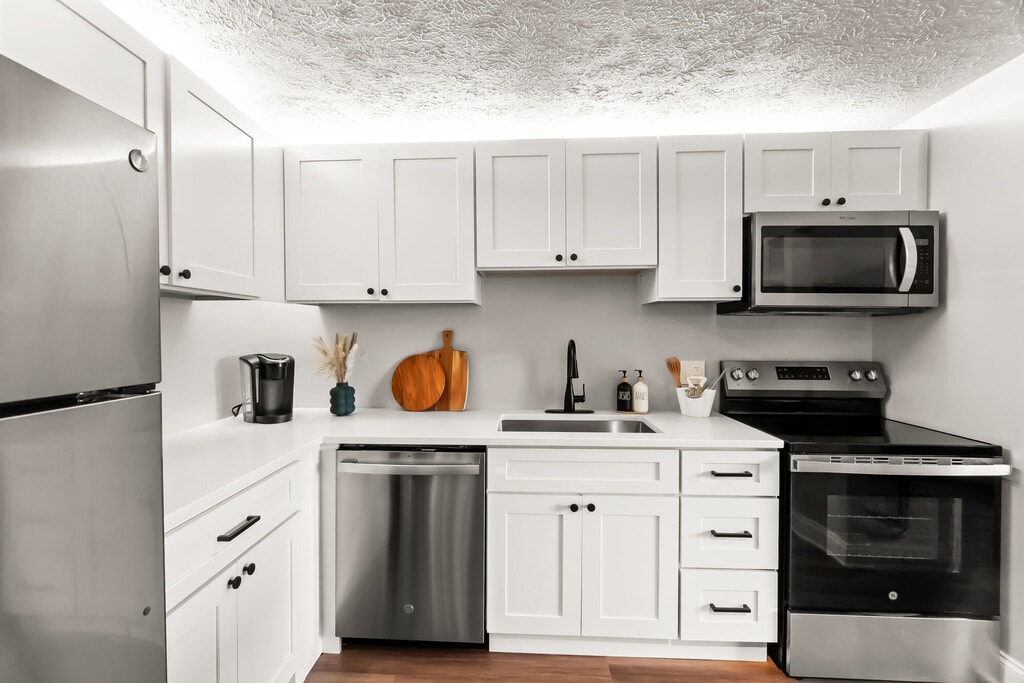 - Electrodomésticos de acero inoxidable con encimeras de granito solo en las suites