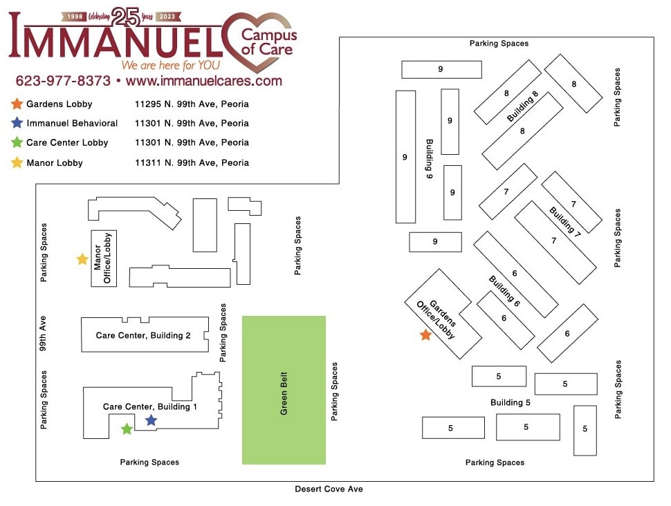 The Gardens floor plans at Immanuel's Campus of Care are perfect for our aging adults. These structures are thoughtfully crafted to ensure residents and staff can move around effortlessly. Whether you are on the garden level or take the cozy staircase or elevator up to the second floor, our two-story independent living community is built with both practicality and aesthetics. The Gardens is designed for residents wishing to retain maximum independence while enjoying all the amenities offered at Immanuel Campus of Care. Residents can choose between one or two-bedroom apartments, and we’re sure you’ll find a space that’s just right to call your own. Our independent living apartments welcome Section 8 Housing and offer some of the most budget-friendly housing in the West Valley and through Maricopa County. We strive to help seniors throughout the greater Phoenix area enjoy their golden years by providing excellent amenities, engaging activities, and a sense of community. Please contact us to tour our beautiful desert living community today! We are dedicated to providing the highest standards in our care to guests, interactions with our associates, and in our efforts to raise the quality of life for all. We are committed to our belief in services with integrity for our guest, their families, our associates, and our business associates.