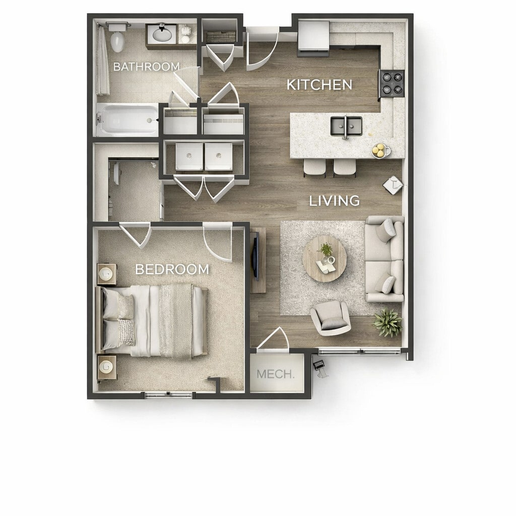 Modelo de apartamento: 1 Bed, 1 bathDesde $8291 Dormitorio, 1 Baño, 642-690 sq ftDisponible March 6, 2026![]()