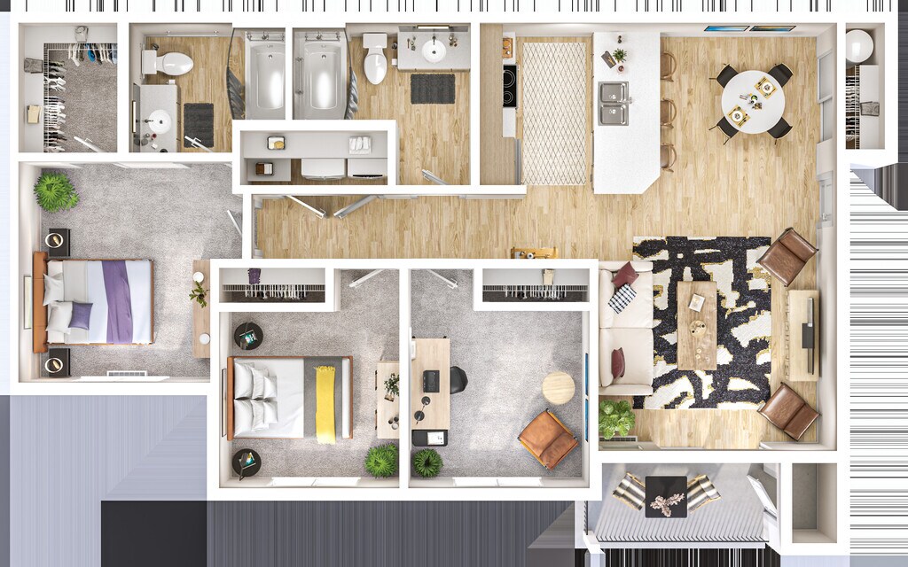 Modelo de apartamento: A2Desde $1,5501 Dormitorio, 1 Baño, 824 sq ftDisponible Ahora![]()