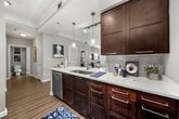 - Gabinetes personalizados con encimeras de cuarzo y protector contra salpicaduras de azulejos