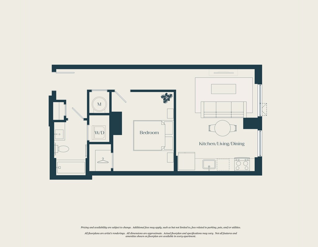0 Bed - 1 Bath | S01 - Plano 1 Los planos son representaciones artísticas. Todas las dimensiones son aproximadas. El producto y las especificaciones reales pueden variar en tamaño o detalle. No todas las características están disponibles en cada vivienda en alquiler. Por favor, consulta con un representante para obtener más detalles.