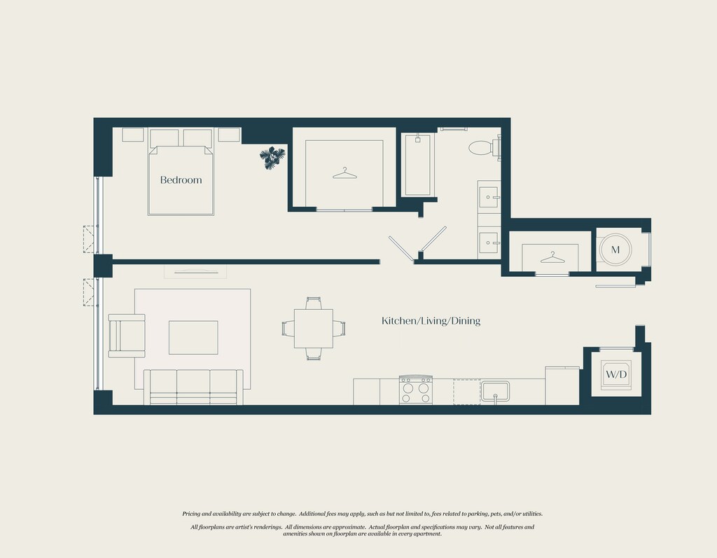 Modelo de apartamento: 0 Bed - 1 Bath | S04$2,705Estudio, 1 Baño, 601 sq ftDisponible AhoraLos planos son representaciones artísticas. Todas las dimensiones son aproximadas. El producto y las especificaciones reales pueden variar en tamaño o detalle. No todas las características están disponibles en cada vivienda en alquiler. Por favor, consulta con un representante para obtener más detalles.