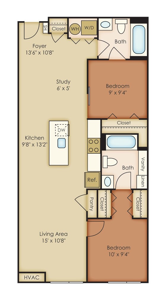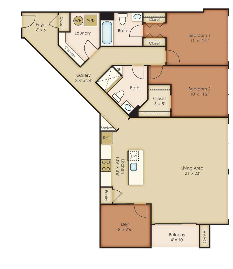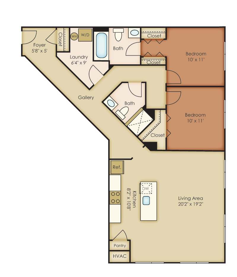 Modelo de apartamento: C2$2,1741 Dormitorio, 1 Baño, 930 sq ftDisponible AhoraLos planos son representaciones artísticas. Todas las dimensiones son aproximadas. El producto y las especificaciones reales pueden variar en tamaño o detalle. No todas las características están disponibles en cada vivienda en alquiler. Por favor, consulta con un representante para obtener más detalles.