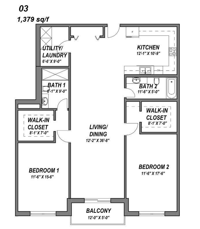 03 - Plano 1 Unidad de apartamento: 203Modelo de apartamento: 03$3,1022 Dormitorios, 2 Baños, 1379 sq ftDisponible Ahora01-02