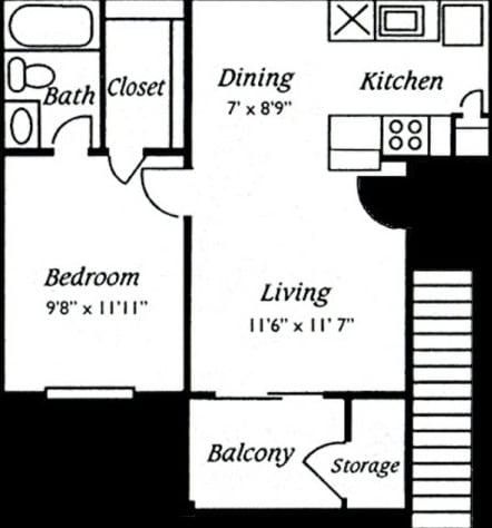 Modelo de apartamento: A4Desde $8851 Dormitorio, 1 Baño, 651 sq ftDisponible Ahora![]()