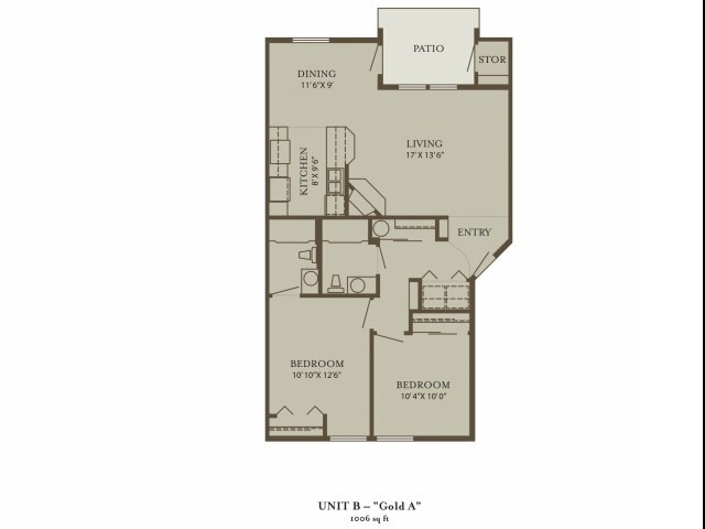 Modelo de apartamento: Gold A2 Dormitorios, 2 Baños, 1006 sq ftDisponible March 15, 2026Los planos son representaciones artísticas. Todas las dimensiones son aproximadas. El producto y las especificaciones reales pueden variar en tamaño o detalle. No todas las características están disponibles en cada vivienda en alquiler. Por favor, consulta con un representante para obtener más detalles.