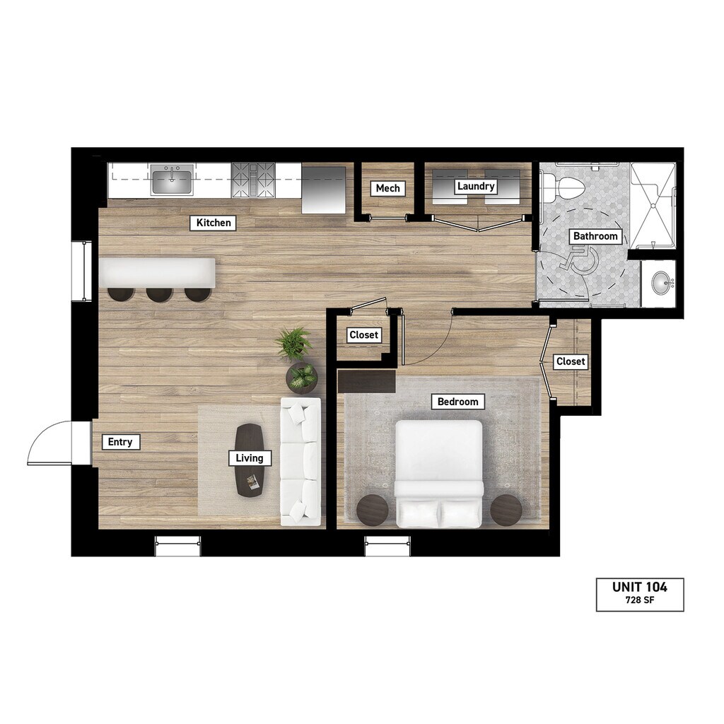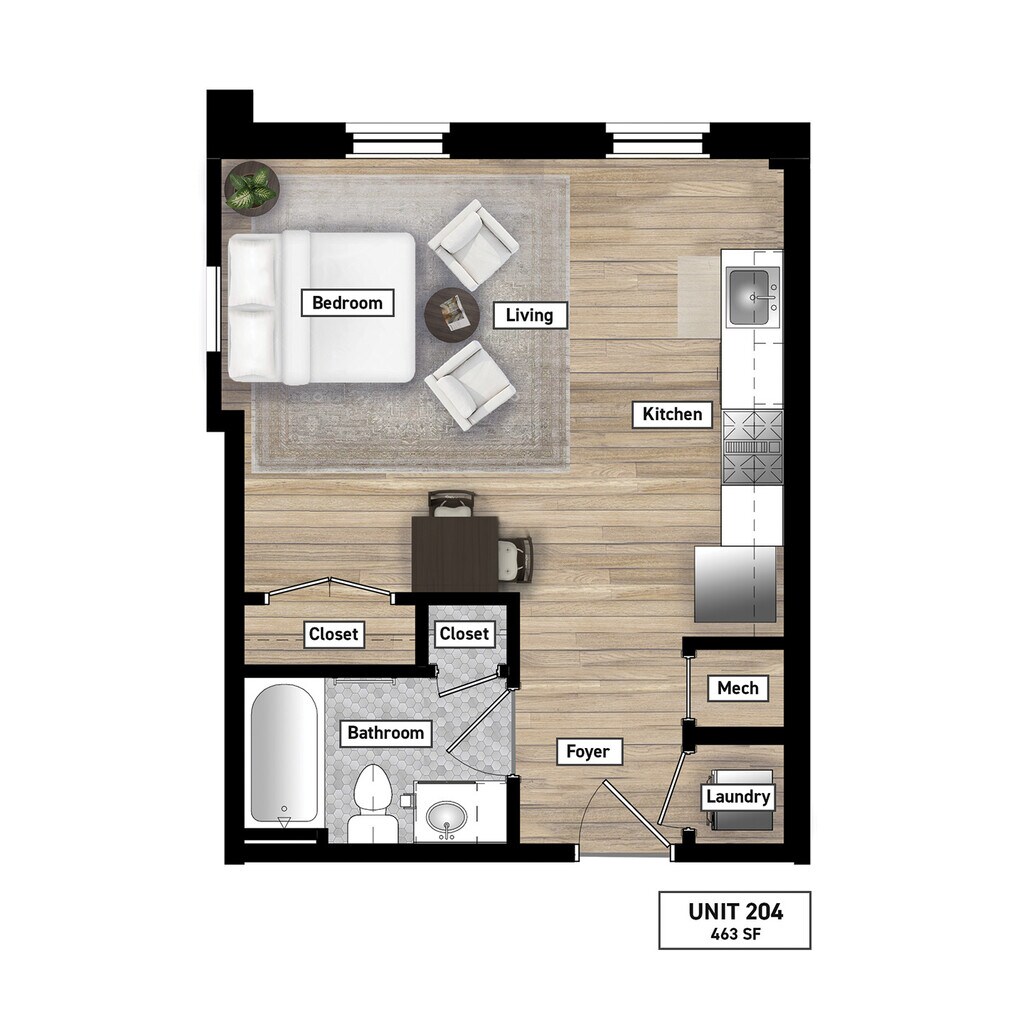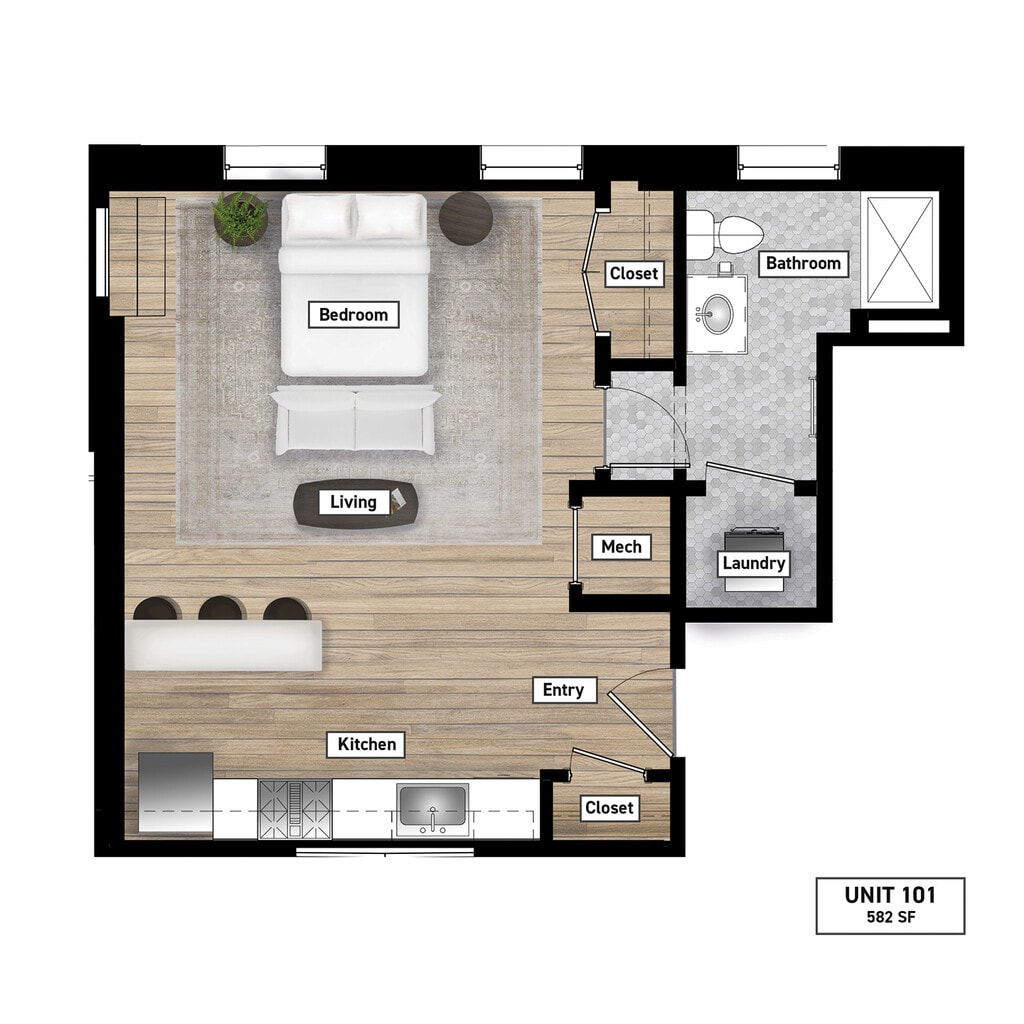 The Curley - Plano 4 Unidad de apartamento: 101Modelo de apartamento: The Curley$1,750Estudio, 1 Baño, 583 sq ftDisponible January 1, 2026The Bouldin