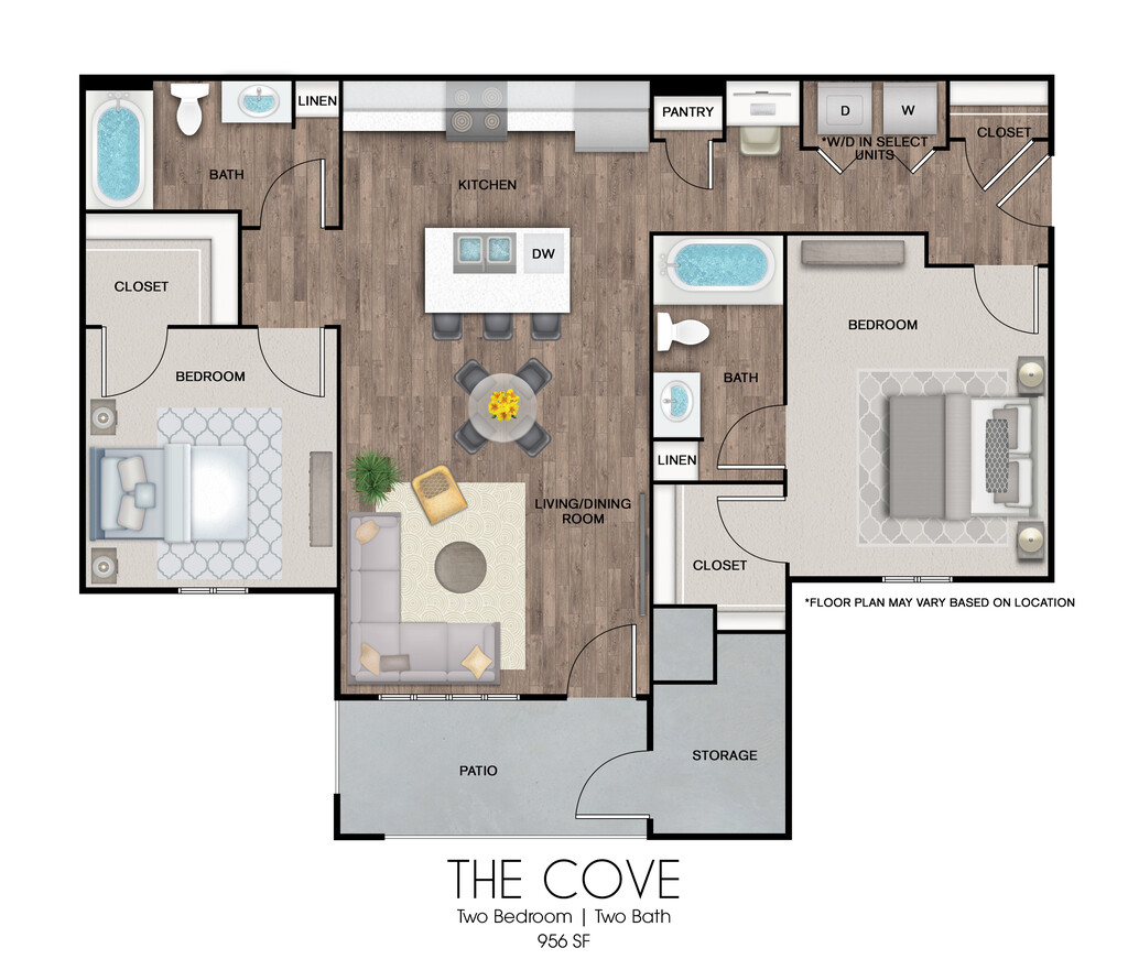 Modelo de apartamento: The CoveDesde $1,2992 Dormitorios, 2 Baños, 956 sq ftDisponible Ahora![]()