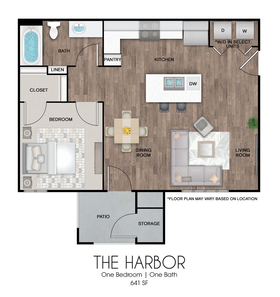 The Harbor - Plano 1 Unidad de apartamento: 734Modelo de apartamento: The Harbor$1,1991 Dormitorio, 1 Baño, 641 sq ftDisponible Ahora2 Dormitorios