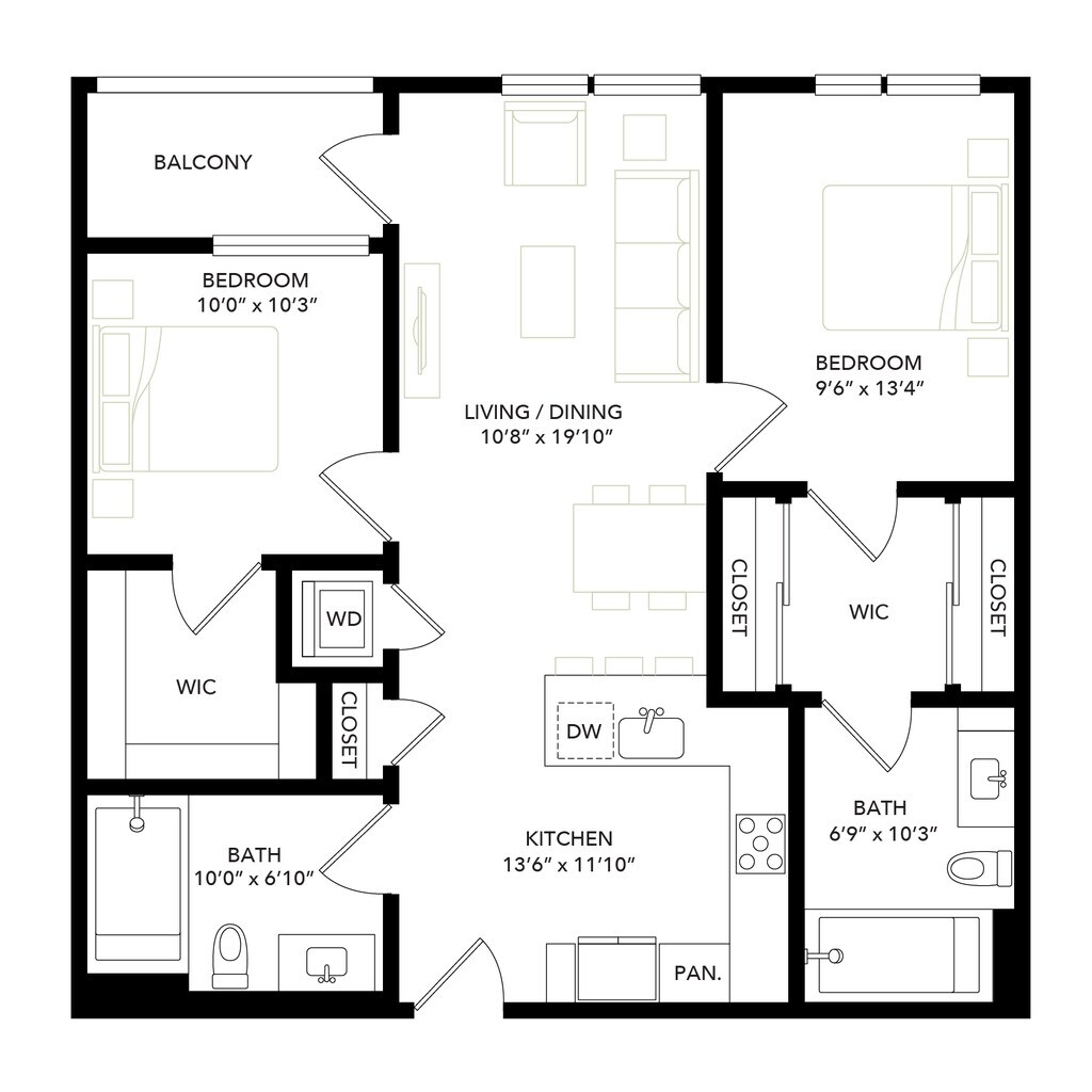 Modelo de apartamento: A3Desde $3,6501 Dormitorio, 1 Baño, 694 sq ftDisponible AhoraPlanosFotos![]()