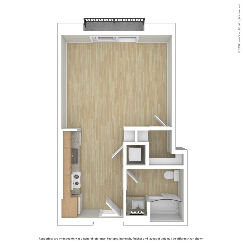 Studio - Plano 1 Los planos de la planta son una interpretación artística. Todas las dimensiones son aproximadas. Los tamaños o el detalle del producto real y sus especificaciones pueden variar. No todas las características están disponibles en todos los hogares para rentar. Los precios y la disponibilidad están sujetos a cambios. El alquiler que se muestra es mensual. Se pueden aplicar ciertos cargos, por ejemplo, entrega de paquetes, recolección de basura, agua, servicios, etc. Depositos varian. Consulta a un representante para conocer detalles.