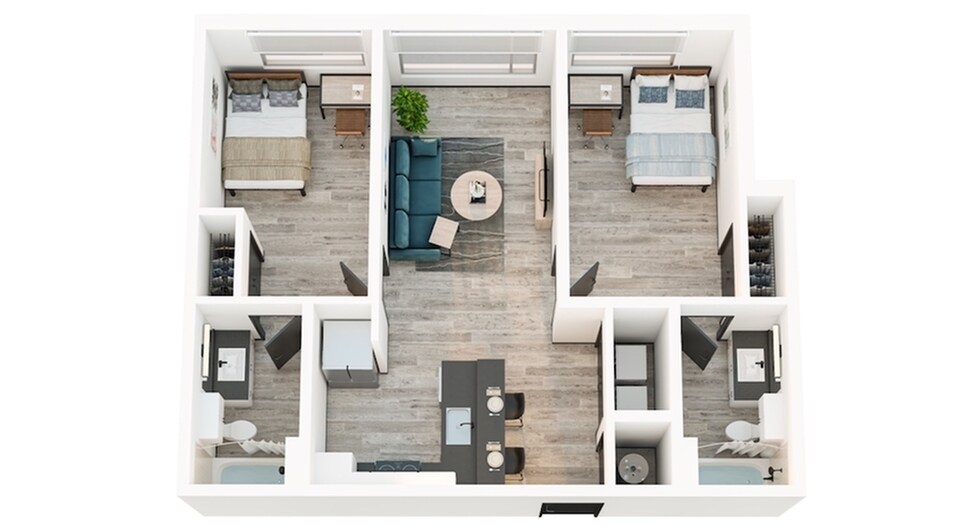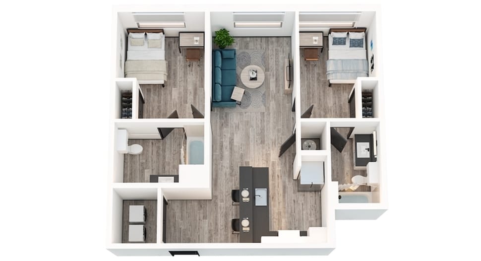 2x2B - Plano 1 Unidad de apartamento: PrivateModelo de apartamento: 2x2B2 Dormitorios, 2 Baños, 776 sq ftDisponible August 18, 20262x2C
