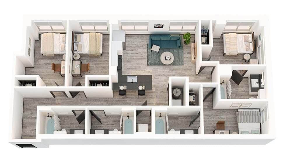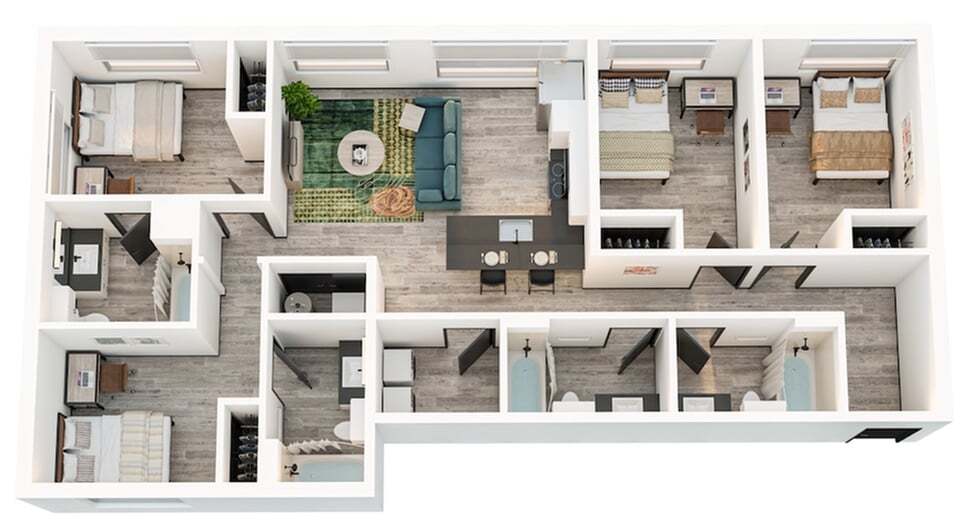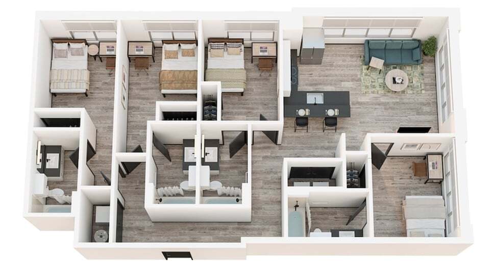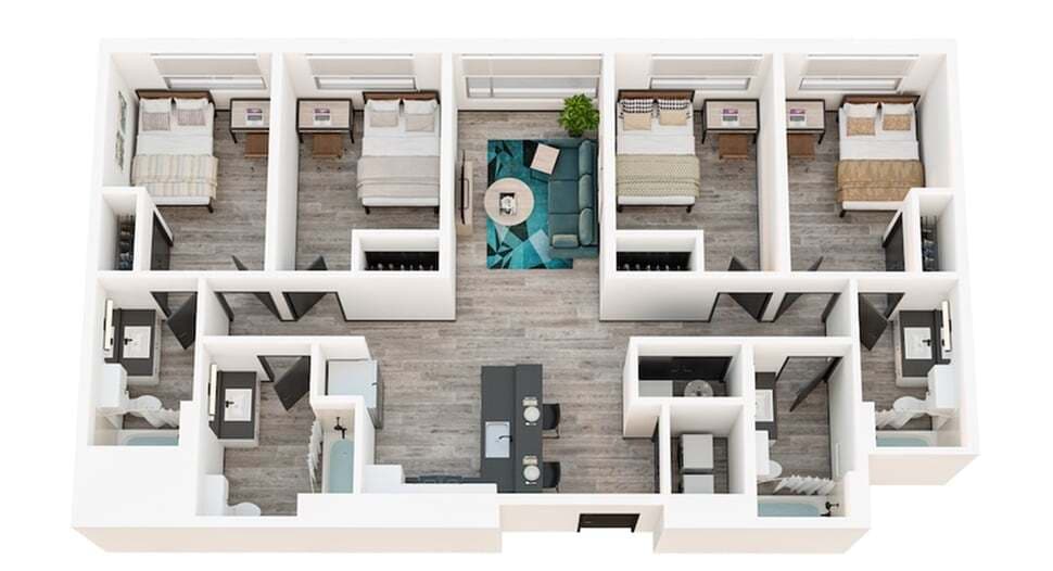 4x4D - Plano 1 Unidad de apartamento: PrivateModelo de apartamento: 4x4D4 Dormitorios, 4 Baños, 1262 sq ftDisponible August 18, 20264x4B