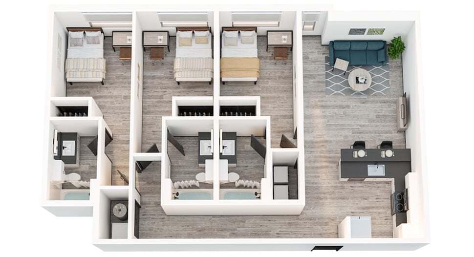 3x3A - Plano 1 Unidad de apartamento: PrivateModelo de apartamento: 3x3A3 Dormitorios, 3 Baños, 1152 sq ftDisponible August 18, 20264 Dormitorios