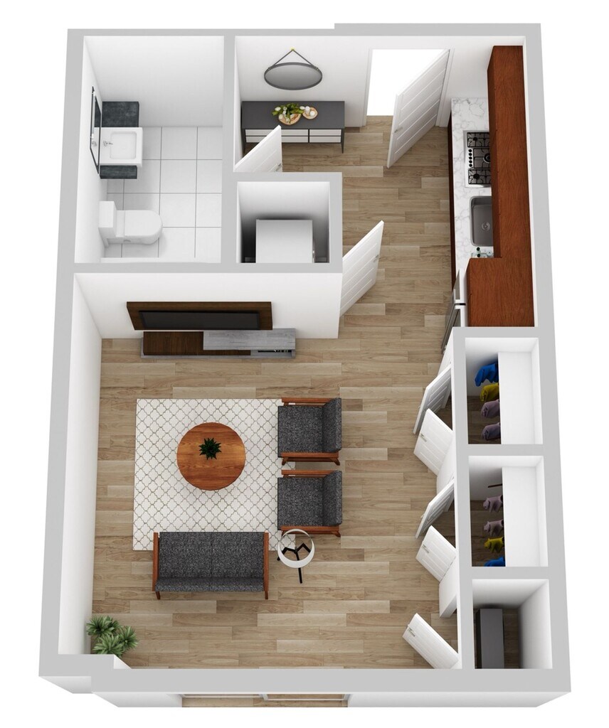 Modelo de apartamento: B01 SIM - The Link$1,350Estudio, 1 Baño, 402 sq ftDisponible March 15, 2026PlanosFotos![]()