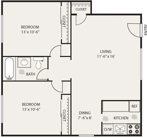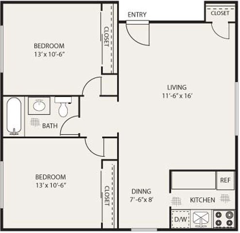 2 Dormitorios, 1 Baño, 750 pies²Disponible AhoraGalería del Modelo