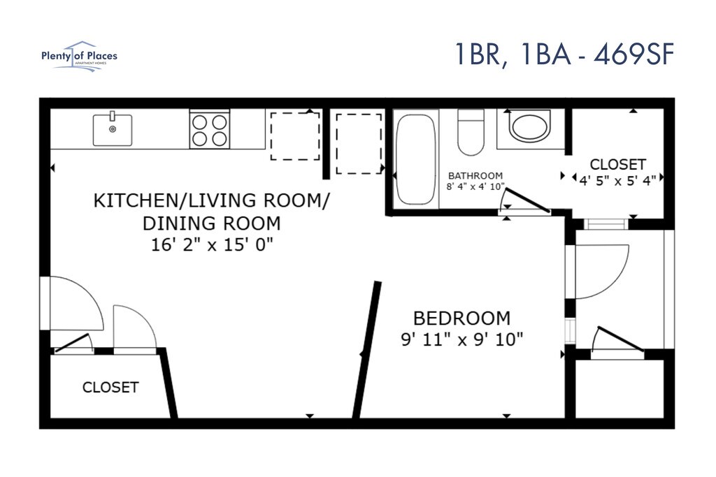 1 Dormitorio, 1 Baño, 441-469 pies²Precio Mensual TotalDisponible AhoraGalería del Modelo