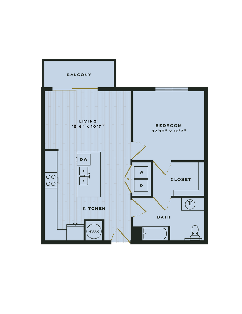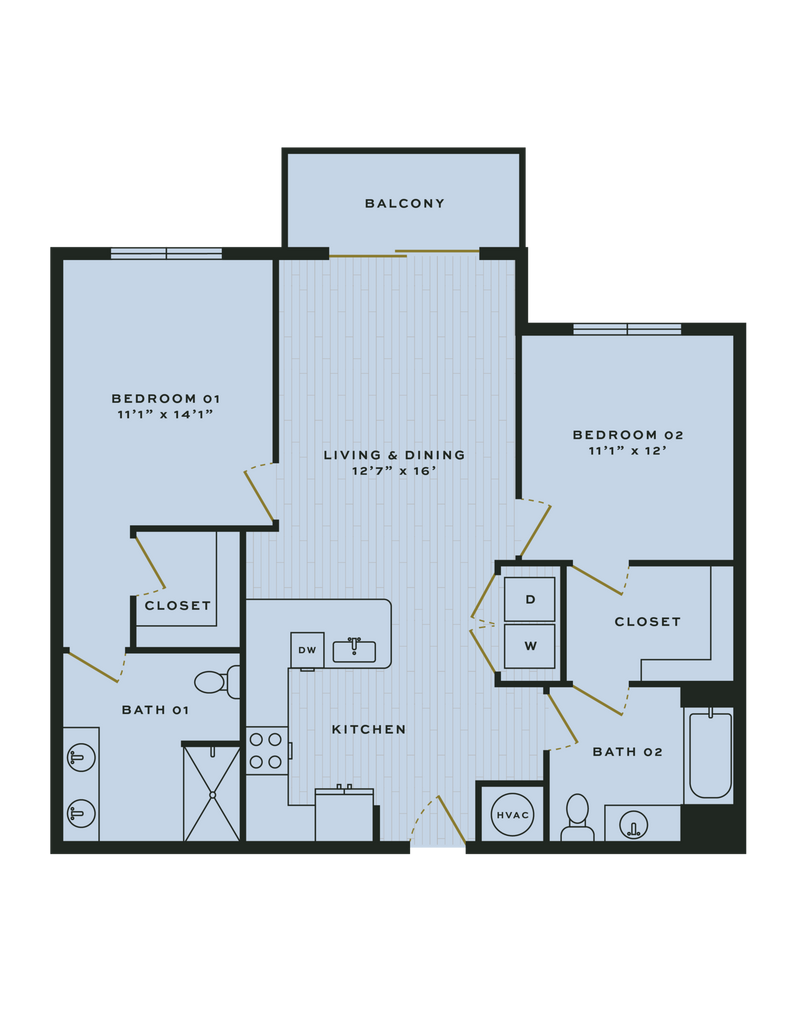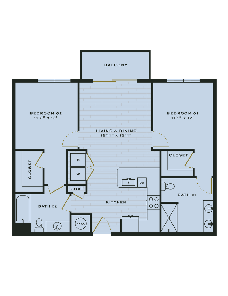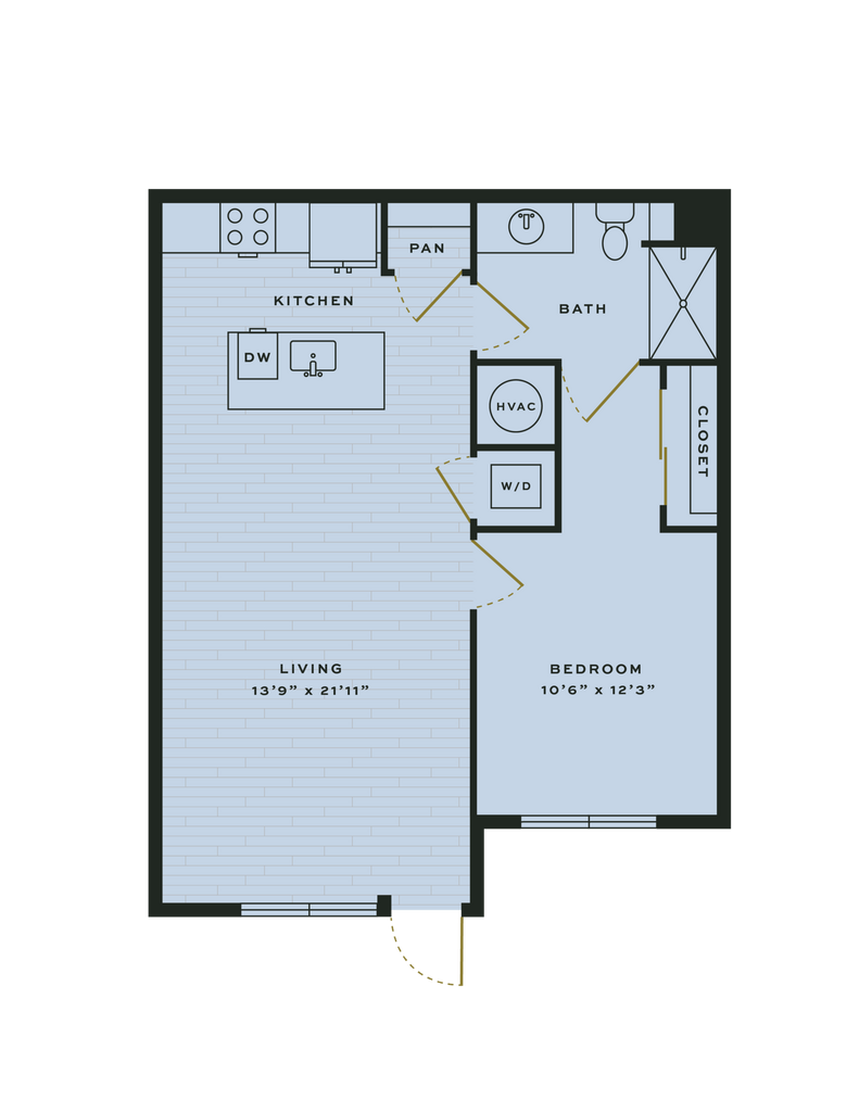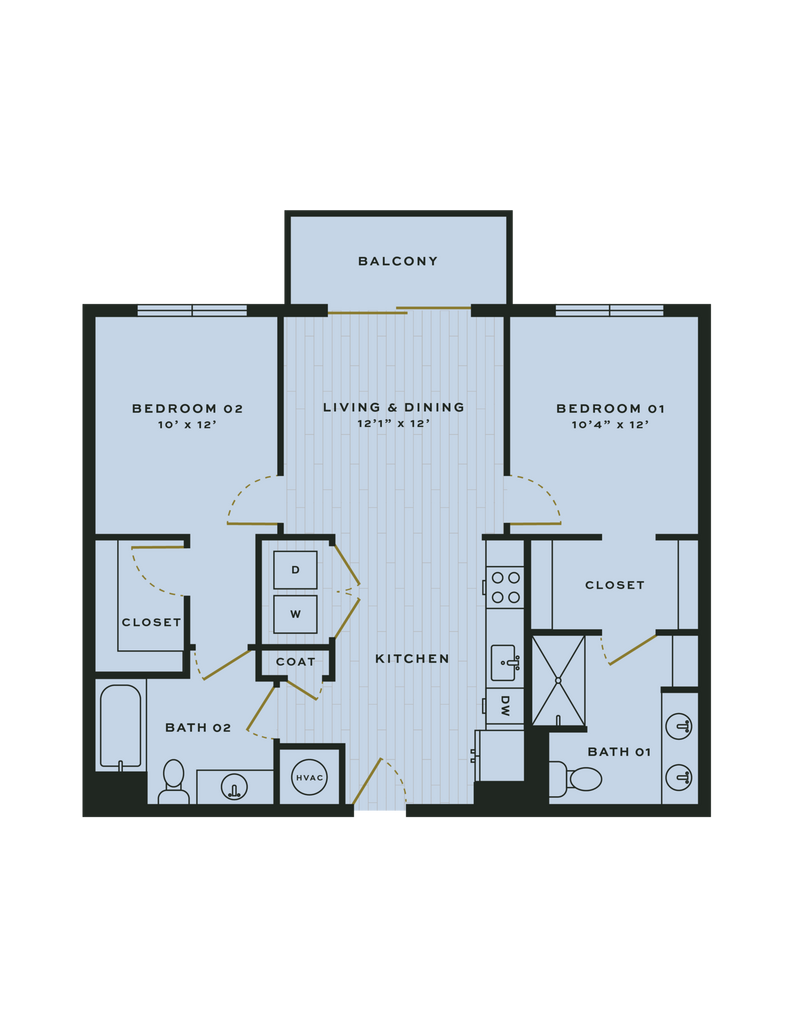 A2 - Plano 1 Unidad de apartamento: 2-121Modelo de apartamento: A2$1,5231 Dormitorio, 1 Baño, 766 sq ftDisponible AhoraPlano: D1