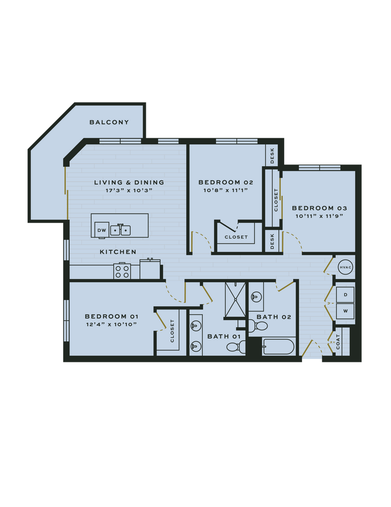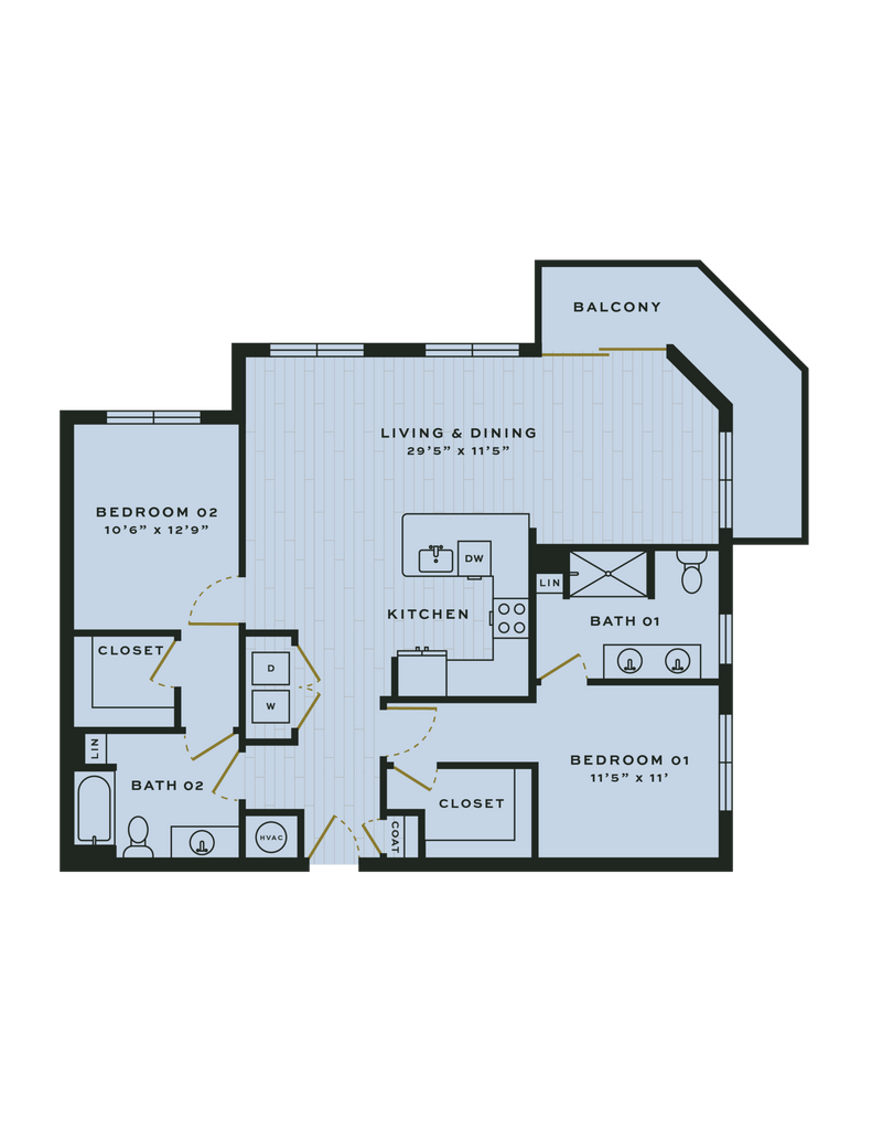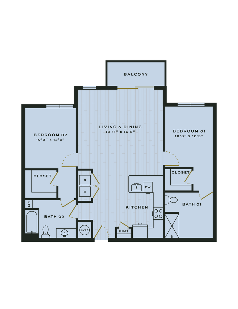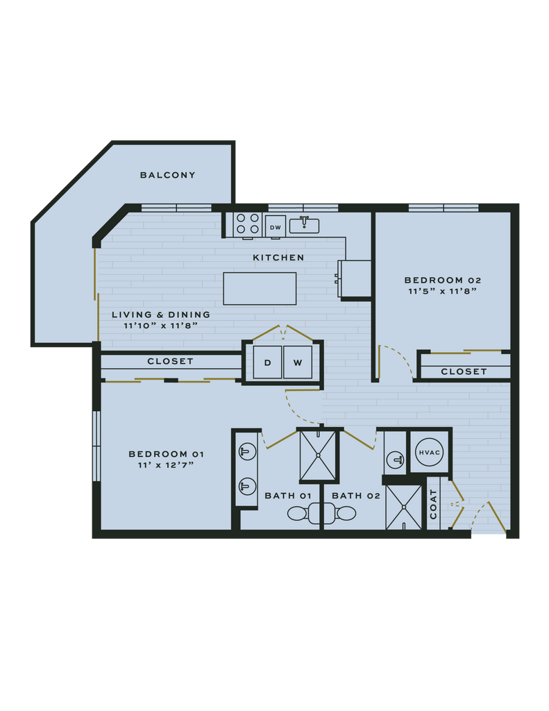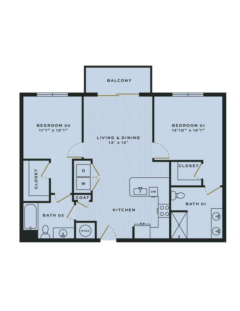 A2 - Plano 1 Unidad de apartamento: 2-121Modelo de apartamento: A2$1,5231 Dormitorio, 1 Baño, 766 sq ftDisponible AhoraPlano: D1