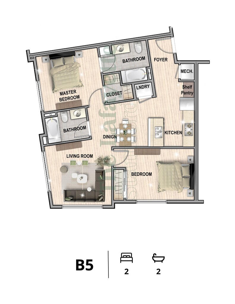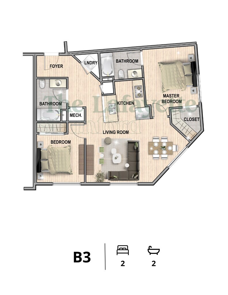 2 Dormitorios, 2 Baños, 1040 pies²Precio Mensual TotalDisponible AhoraGalería del Modelo