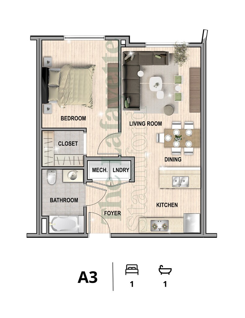 Modelo de apartamento: A1Desde $2,5001 Dormitorio, 1 Baño, 730 sq ftDisponible Ahora![]()