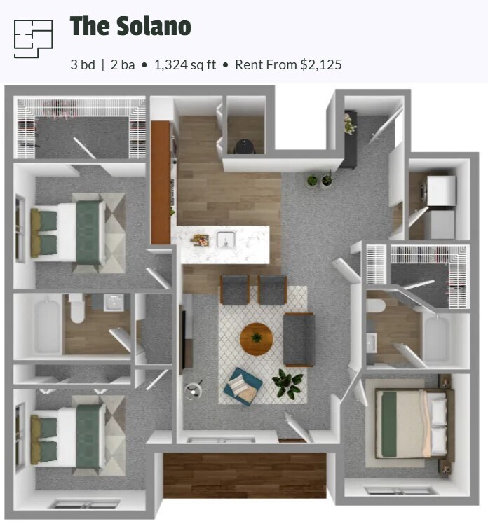 Modelo de apartamento: The Solano$2,2303 Dormitorios, 2 Baños, 1324 sq ftDisponible Ahora![]()