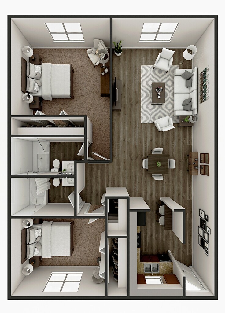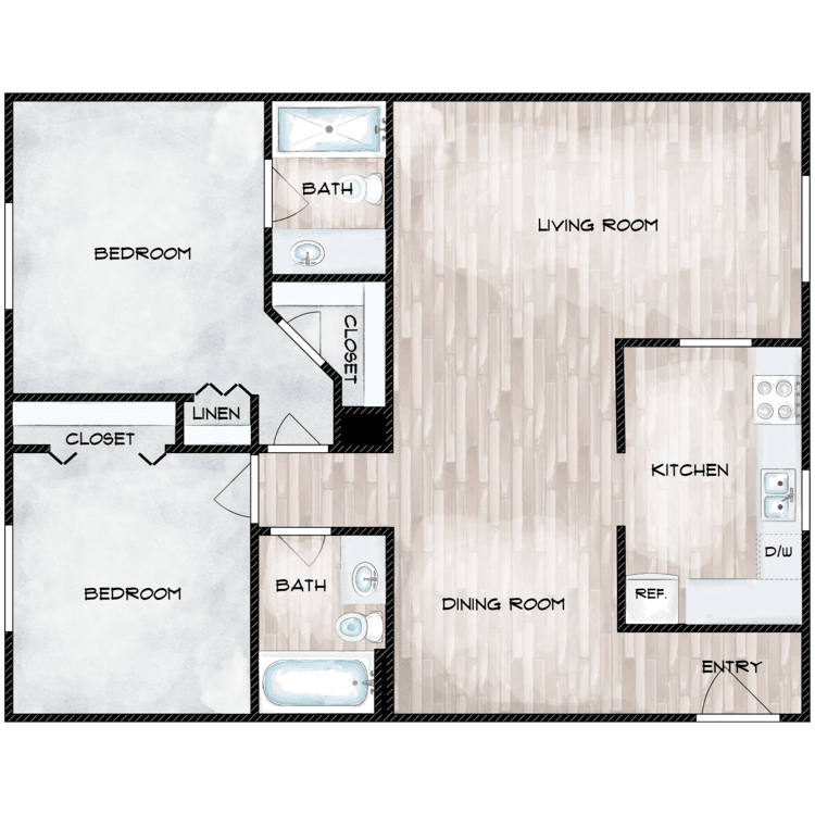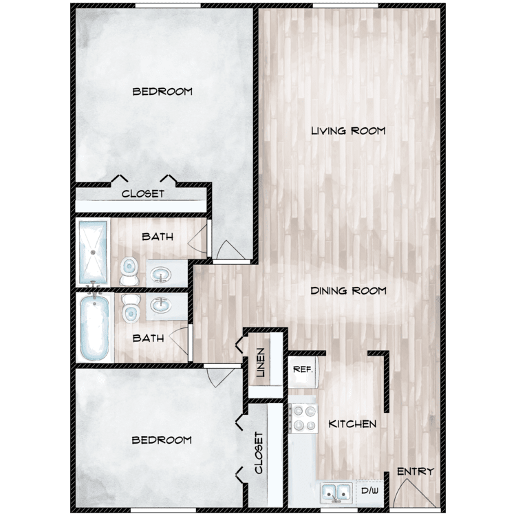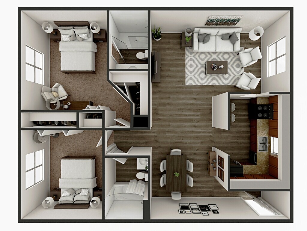 Modelo de apartamento: Two Bedroom One Bath DeluxeDesde $1,2502 Dormitorios, 1 Baño, 940 sq ftDisponible Ahora![]()