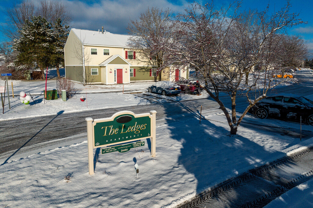 Apartamentos en alquiler cerca de Fort Drum. Ubicado en un entorno campestre tranquilo, a la salida de la ruta 11 North y frente a la entrada North Gate de la base militar Fort Drum, The Ledges cuenta con personal de administración en el lugar y un servicio de mantenimiento las 24 horas y está convenientemente ubicado cerca de un Super Walmart, centros comerciales, restaurantes y la autopista interestatal 81. Todos los alquileres incluyen agua, alcantarillado, recolección de basura, remoción de nieve y cuidado del césped. Las características incluyen una lavandería recientemente renovada con nuevas lavadoras y secadoras con tarjeta inteligente, áreas de juegos para niños y una cancha de básquetbol.