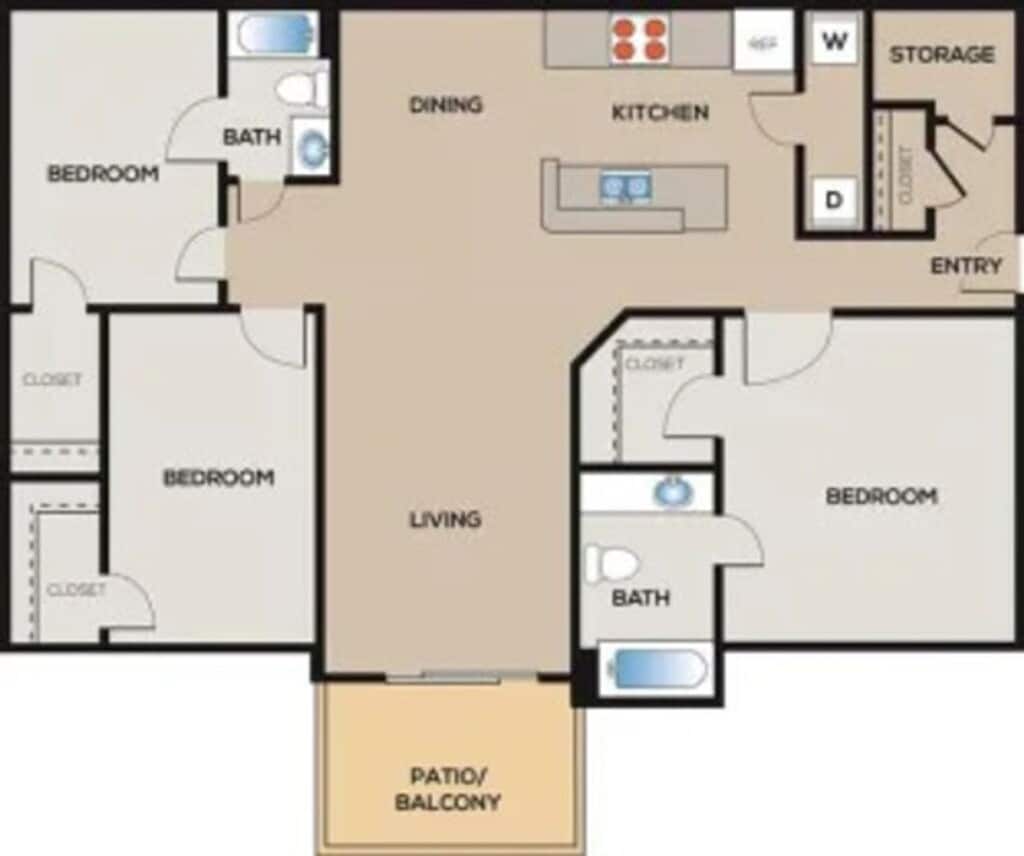 6189C1P - Plano 2 Unidad de apartamento: 812Modelo de apartamento: 6189C1P 3 Dormitorios, 2 Baños, 1255 sq ftDisponible Ahora6189C1R