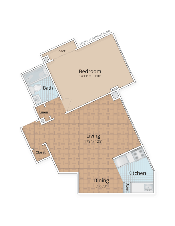 1 Dormitorio, 1 Baño, 625-785 pies²Disponible AhoraGalería del Modelo