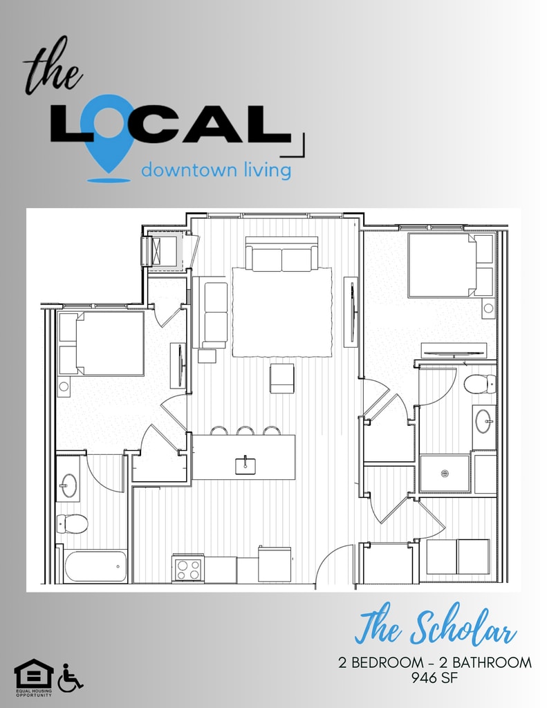 Modelo de apartamento: The Scholar$1,9002 Dormitorios, 2 Baños, 946 sq ftDisponible AhoraThe Scholar - Plano 1 The Sigma