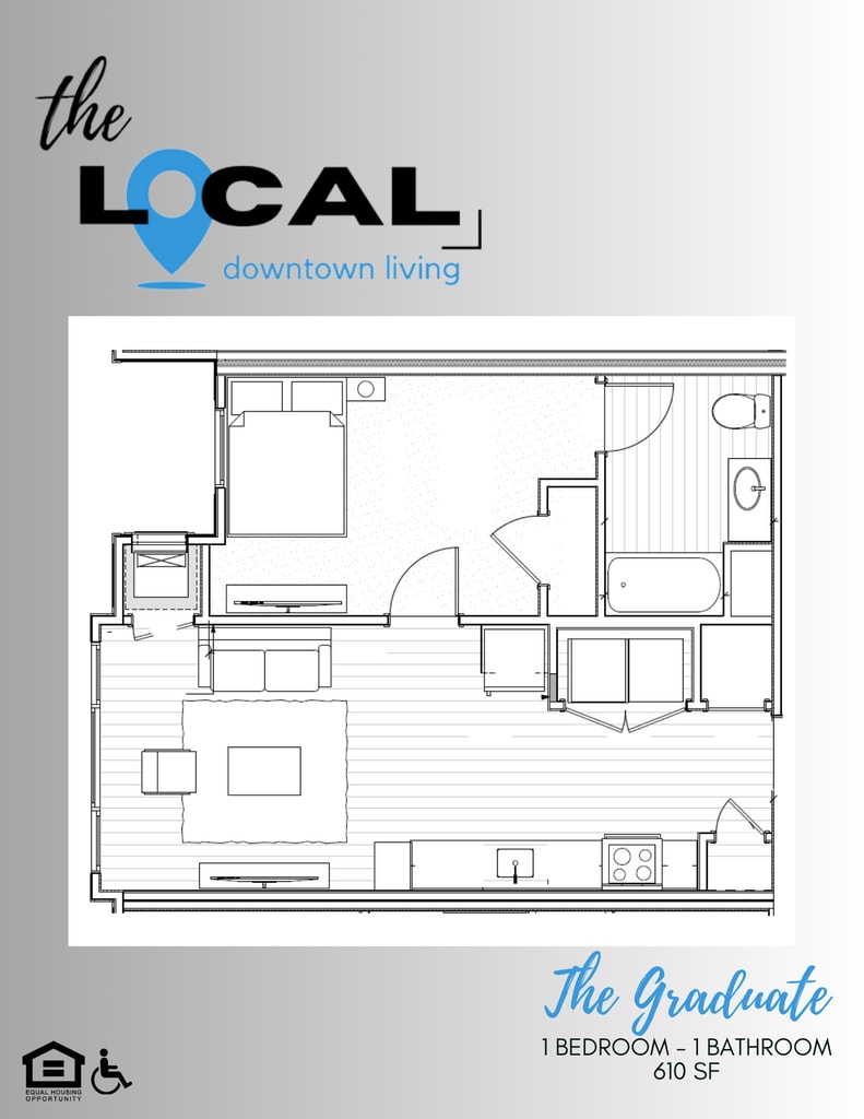 Modelo de apartamento: The Graduate$1,7001 Dormitorio, 1 Baño, 610 sq ftDisponible AhoraThe Graduate - Plano 1 2 Dormitorios